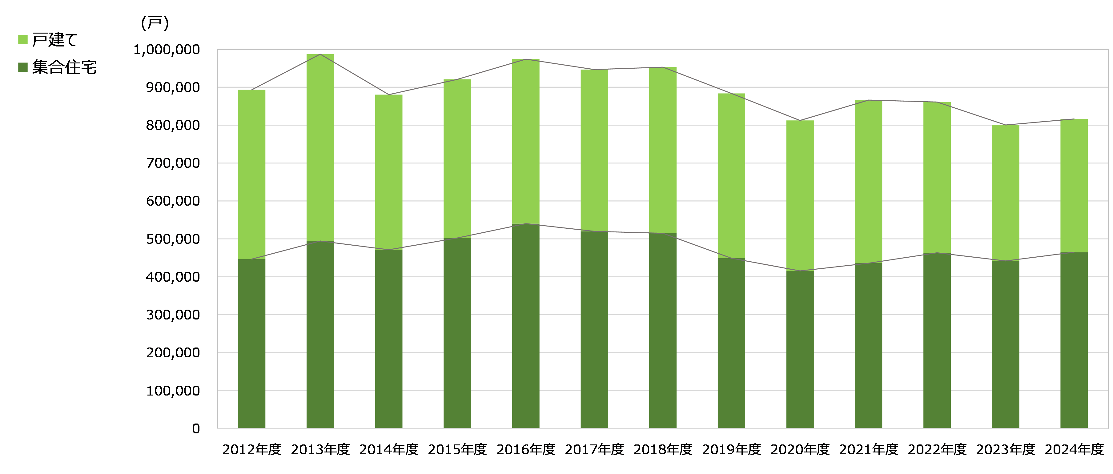 2024年度の数値をみると、新築住戸数(約82万戸)のうち、集合住宅は約46.5万戸で全体の約57.0%を占めています。