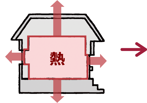 断熱とは、壁、床、屋根、窓などを通しての住宅の内外の熱の移動を少なくすることです。冬、暖房を行っているとき、外気と比較して室内の温度が高くなるので、熱は室内から室外に移動します。夏、冷房を行っているとき、外気に対して室内の温度が低くなるので、熱は室外から室内に移動します。この移動をなるべく減らすことにより、少ないエネルギーで効率よく暖冷房を行うことができます。