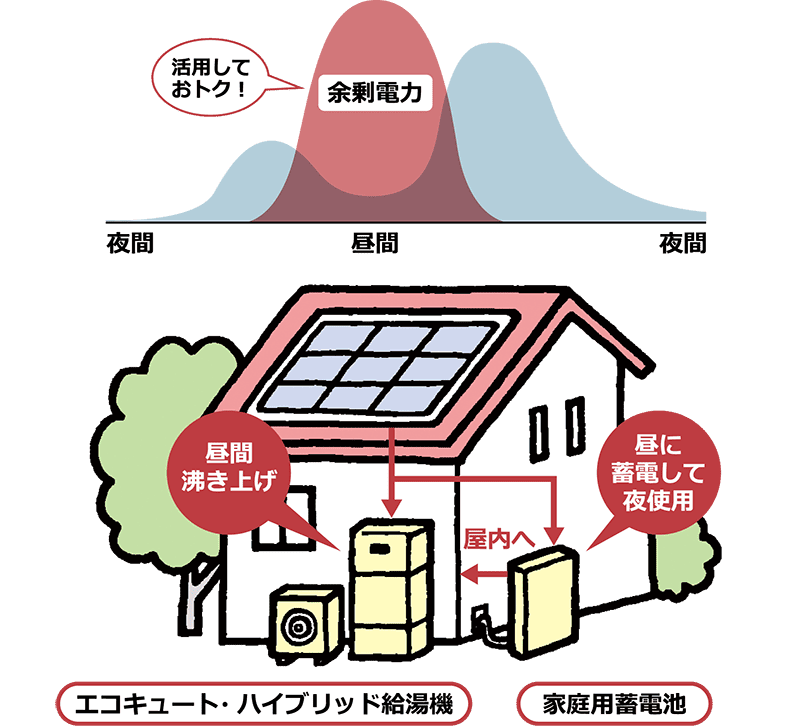 また、給湯器に昼間沸き上げ機能を有する電気ヒートポンプ式給湯機(エコキュート)や、ハイブリッド給湯機を導入することで、自宅の太陽光発電で発電された創電力を有効活用することが可能になります。