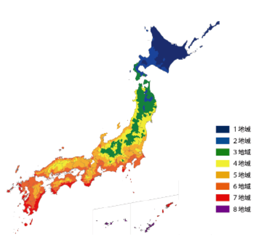 日本を8つの地域に区分し、各地域において等級に応じたUA値とηAC値が定められています。