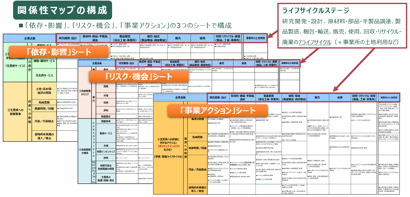 2025年2月には電機・電子業界の企業活動と生物多様性との関係性を整理したマップVer.3.0を発表しました。TNFDのスコーピングやLEAPアプローチ等で推奨する「依存と影響」「リスクと機会」「事業アクション」のマテリアルな項目を抽出する上で役立ちます。当業界以外の幅広い事業セクターで活用可能な内容ですので多くの方にご利用いただけますと幸いです。
